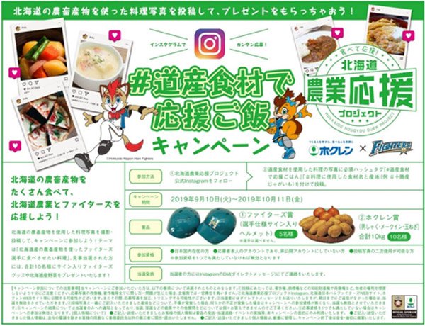 9月10日(火)より「北海道農業応援プロジェクト #道産食材で応援ご飯 インスタグラムキャンペーン」を実施します。インスタグラムで、北海道農業応援プロジェクト公式アカウント(@hokkaido_nougyoouen_project)をフォロー&指定ハッシュタグをつけて “北海道産の農畜産物”を使用したファイターズ選手に食べさせたい料理写真を投稿するキャンペーンです。応募してくれた方の中から、15名様に選手仕様サイン入りヘルメットや北海道産野菜をプレゼントいたします。皆様のたくさんの投稿をお待ちしております。