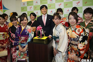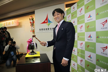 北海道日本ハムファイターズの田中賢介選手が1月4日(月)、札幌証券取引所の大発会に出席し、新設された「札証の鐘」の打ち初めを行いました。振袖姿の女性職員や理事を前にして、「初打ちの大役を務めさせていただきとても光栄です。皆さんと手を取り合って北海道を笑顔にしていきたい」と語り、真新しい鐘を3回打ち鳴らして取引開始を祝いました。
