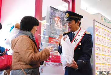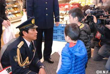 その後町内のスーパーに移動し道内でも社会課題となっている交通事故、特殊詐欺撲滅の啓発活動を行いました。買い物に訪れた町民ひとりひとりに「車には気をつけてください」と声をかけながらパンフレットを配布しました。大役を務めた栗山監督は「日々安心して暮らせるのは働いている警察官のみなさんのお陰なので感謝の気持ちを述べました。栗山町で優勝パレードをやらせてもらった時も間違いなく迷惑をかけていたと思います。警備は寒い中大変だろうけれども再びパレードができる様に前に進みたいです」と締めくくりました。