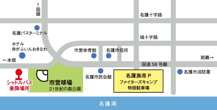 2月17日(水)より沖縄県名護市にて行われる春季キャンプ期間中の名護市営球場へのアクセスについてお知らせいたします。春季キャンプ期間中[2月17日(水)~2月28日(日)]は、近隣の周辺駐車場は野球観戦(ファイターズ春季キャンプ見学)の方はご利用できませんので、特設駐車場およびシャトルバスをご利用ください。