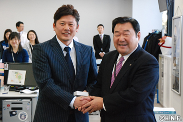 北海道日本ハムファイターズは1月20日(水)、札幌・豊平区の球団事務所でOBの稲田直人氏の本拠地開幕シリーズスペシャルプロジェクトメンバー(2連戦満員担当)就任式を行いました。3月29日(火)・30日(水)のオリックス・バファローズ戦(札幌ドーム)に向けて、竹田憲宗代表取締役社長から「事業統轄本部長付プロジェクトメンバー」の肩書き入り名刺を受け取り「僕自身、新たなチャレンジを楽しみにしています」と職員を前に挨拶しました。