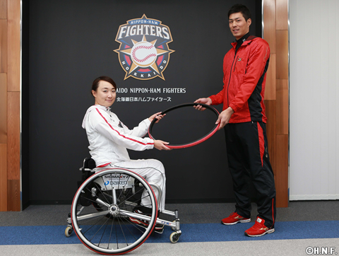 - 「ファイターズのファンなので、岡選手と一緒に取り組みをできる事を嬉しく思います。リハビリを頑張っている人、障害を持っている人に何かしたいと感じていましたし、岡選手のその様な思いに感動しました。このプロジェクトをきっかけに車いすテニスに興味を持つ人もいると思いますので、私もいただいたタイヤを履いて、リオデジャネイロパラリンピックを目指して頑張ります」