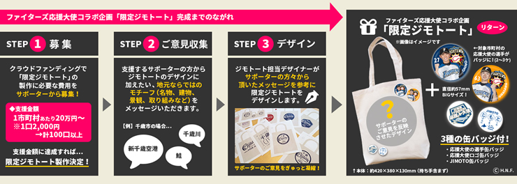 この度北海道日本ハムファイターズでは、株式会社ジムニーワークス(所在地:札幌市中央区、代表取締役社長:珊瑚 和範)が展開するオリジナル企画商品『JIMOTOTE(ジモトート)』と〈北海道179市町村応援大使〉の活動を連動させた〈ファイターズ応援大使と一緒にジモトートで「じ・も・と」を応援しよう!〉をスタートいたします。