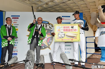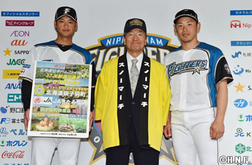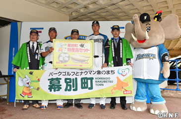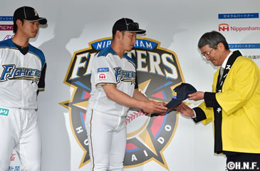 続いて、パークゴルフ発祥の地で人口約27,000人の幕別町は、毎年公式戦が開催されている帯広市とも隣接しており選手とも馴染みの深いまちです。「訪問する時にパークゴルフはやってみたいです。オフにはよい報告をしたいです」と大谷投手、「シーズンを通じて幕別町をPRしていきたいです」と大使としての抱負を述べました。また、飯田町長からはゆり根1kg、和稔じょ5kg、ネーム入りのパークゴルフクラブセットがそれぞれ贈呈されました。