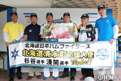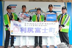 別名利尻富士と呼ばれる1,721mの独立峰利尻山がそびえ立つ利尻富士町の2016年応援大使は増井浩俊投手と石川亮選手。名物の利尻昆布やウニなどの特産品セットを田村祥三町長から贈呈いただくと、増井投手は「静岡生まれで富士山を眺めて育ったので縁を感じます。昆布は海草の王様と聞いたので、これを食べてセーブ王を目指したい」石川亮選手は「これを機に、北海道の人と一つになれる様頑張りたい」と抱負を述べました。