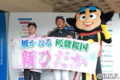 この日最後の訪問となるのは、サラブレットの生産頭数日本一で日高振興局の新ひだか町。同町サポート大使の「こんぶマン」と一緒に名護に訪れました。10戦10勝無敗のダービー馬と同名「トキノミノル」と「万馬券」という馬産地ならではの地場産米が近藤健介選手、浦野博司投手不在のため代理で栗山英樹監督に手渡されました。「こんぶマンみたいに粘り強い野球を目指していきたいです」と指揮官は御礼の言葉で会を締めくくりました。