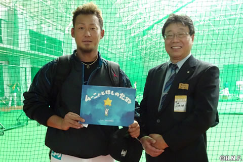 絵本の里として知られる剣淵町のまちの中央部には約45,000冊の絵本を蔵書する「絵本の館」が建てられ、同施設では毎年「けんぶち絵本の里大賞」という来館者が選ぶ絵本に対する賞を贈呈しています。絵本の里剣淵町の早坂町長からは、同町制作の絵本「ムーニャとほしのたね」とトマト、にんじん等の新鮮な野菜が両選手に贈られました。中田選手は「皆様の期待に応えられるように、シーズン通して活躍して『剣淵町』を広めていきたいです」と応援大使としての意気込みを強く語りました。