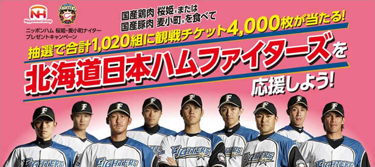 北海道日本ハムファイターズと日本ハムグループは、4月15日(金)まで〈桜姫・麦小町ナイター〉プレゼントキャンペーンを実施中です。対象のスーパーで国産鶏肉「桜姫(R)」又は国産豚肉「麦小町(R)」を購入し、シールを2枚集めて応募いただくと、抽選で1,020名様に、5月11日(水)に東京ドームで行われる北海道日本ハムファイターズ対オリックス・バファローズ戦の観戦チケットや、さらには始球式の権利・練習見学が当たります!国産鶏肉「桜姫(R)」又は国産豚肉「麦小町(R)」を食べて、ファイターズを応援しよう!