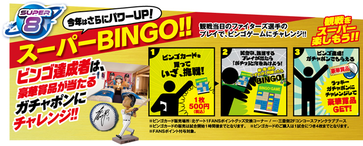 試合観戦をもっと楽しむならFIGHTERS GALAXY BINGO!当日のファイターズ選手のプレイと、1枚500円のビンゴカードに書かれたプレイが縦・横・斜めいずれか1列揃ったらビンゴ!ビンゴ達成なるかは試合のシチュエーション次第。FIGHTERS GALAXY BINGOに参加して、いつも以上にドキドキ・ワクワクの試合観戦をお楽しみください!