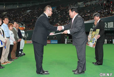 本日3月19日(土)、札幌ドームで開催した東京ヤクルトスワローズとのオープン戦開始前に発表セレモニーを実施しました。支援先である11団体の各代表者様にご来場をいただき、プロジェクト発足の記念として北海道日本ハムファイターズの竹田憲宗代表取締役社長から記念ボード、日本ハム北海道販売株式会社の平下康嗣代表取締役社長から日本ハムグループ商品詰め合わせを贈呈しました。竹田社長は「ファンの皆様にとってスタジアムがチームを力強く後押ししてくださる場であるとともに、私たちと一緒により良い社会づくりに取り組むコミュニティになればと考え、このプロジェクトを立ち上げました。ぜひ趣旨にご理解をいただき、多くの方々のご来場をお待ち申し上げます」と話していました。
