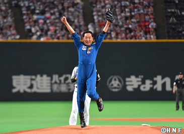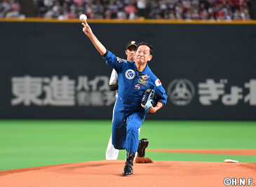 1992年にスペースシャトルエンデバーに搭乗し日本人2人目の宇宙飛行士となった毛利さんは、NASAの訓練服でマウンドへ登場。大きく振りかぶると伸びのあるノーバウンド投球で吉田正選手から空振りを奪い、両手を突き上げてガッツポーズを見せました。野球は小学校以来ながら、力強いボールにスタンドからは惜しみない拍手が送られ「プロ野球のどの投手も憧れる舞台。感激ひとしおです」と笑みをたたえられました。