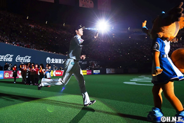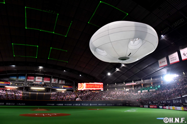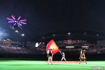 今回、毛利さんをお招きしたのは2016年、本拠地・札幌ドームで行われる主催試合のテーマを「FIGHTERS GALAXY BASEBALL」と設定し、「壮大な宇宙」をイメージした演出、装飾を展開していくことに基づくもの。セレモニーでは発光体をつけたドローンが暗転したグラウンド内を飛行し、宇宙空間を想起させる幻想的な雰囲気が場内を包みました。