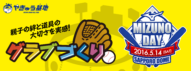 ファイターズオフィシャルスポンサー・ミズノ株式会社では、5月14日(土)に札幌ドームで行なわれる北海道日本ハムファイターズ対埼玉西武ライオンズ戦・《ミズノデー》において、グラブ作りを通じて、親子の絆と道具の大切さを実感できるイベント、〈グラブづくり〉の参加者を募集しております。今回は、グラブを作るだけでなく、試合直前のグラウンドで親子キャッチボールができるプレミアムイベントつき!もちろんその後はペアチケットで試合観戦も!野球少年・少女だけでなく、お父さん・お母さんにも大人気のイベントにぜひ親子でご参加ください。