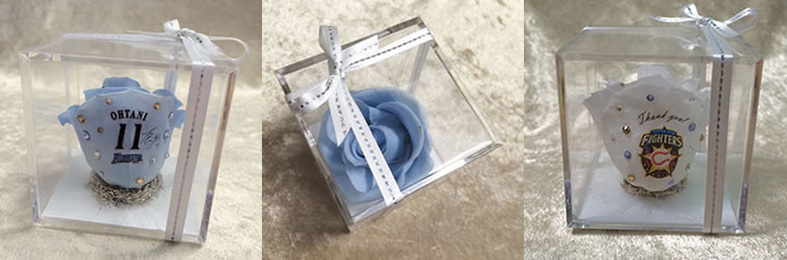ラインストーンをちりばめたプリザーブドローズ。プライマリーマーク入りはライトブルー、ライトピンク、ホワイトの3色で、選手名入りはそれぞれのイメージカラーのバラが10種類。5月8日(日)の母の日までにお届けします。