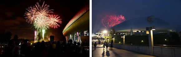 試合終了後、花火開始時間(19:45予定)までに1Fコンコース一塁、三塁の突き当たりから地下2Fへ降り、下記の図の観覧席受付までお越しください。