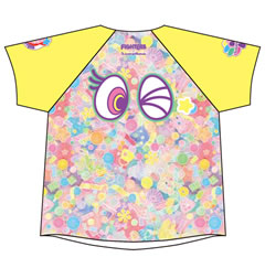 ファイターズの今期テーマ「宇宙」と、自分の小宇宙「Kawaii」の融合をテーマに、女性が可愛く見えてさらにこれを見た選手達が元気をもらえるような、カラフルでハッピーなユニフォームを製作しました。ボディは僕の作品写真をもとに作ったグラフィックの総柄、胸元には魔法少女アニメのようなロゴ、袖は革命の色・黄色をデザインしています。球場で着ても街中で着ても可愛いと思うので、ぜひゲットしてください!