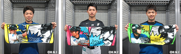 茨城県非公認・納豆の妖精「ねば~る君」と、粘り強いバッティングが持ち味の中島卓也選手との奇跡のコラボレーションが実現!中島卓選手のユニフォームを着用したねば~る君のグッズが登場します。アイテムは、ころんとしたフォルムがかわいいぬいぐるみと、足をひっぱるとびよ~んと伸びるキーチェーンの2種類。5月13日(金)よりオフィシャルオンラインストア、札幌ドーム、オフィシャルショップにて販売いたします。また、このほかにも大人気「選手オリジナルタオル」のリニューアルデザインや、NEWERAキャップの新色などの新商品を発売いたします。
