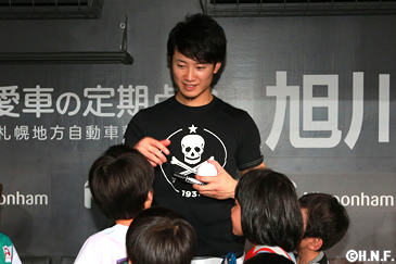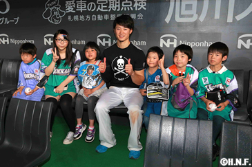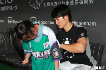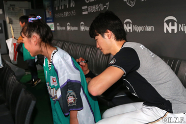 この日は札幌市、北広島市の児童養護施設に案内をした所、約100名を札幌ドームに招待し試合終了後にサインや写真撮影に応じました。「ここに中田選手、ここに陽選手がいつも座っているよ」とベンチで気さくに子どもと触れ合う姿は、数十分前までのグラウンドでは見ることのできない満面の笑顔でした。参加者全員に丁寧にサインをし終えると「みんなの応援で今日ヒットが打てました。僕も頑張るので、みんなも一緒に頑張ろう」と子ども達にメッセージを送り、会を締めくくりました。参加した子どもは「4年前から西川選手が大好きで感激。1ヶ月前から楽しみにしていて、今日のために頑張ってきました」と興奮気味でした。