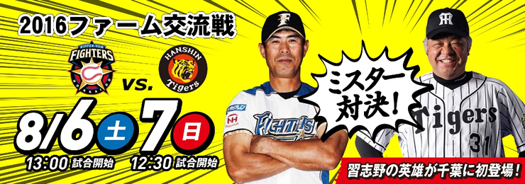 北海道日本ハムファイターズでは、8月6日(土)・7日(日)にファイターズ鎌ケ谷スタジアムにてウエスタン・リーグに所属する阪神タイガースとのファーム交流戦を開催いたします。ファイターズが鎌スタでの主催試合としてファーム交流戦を開催するのは昨年6月の広島戦に続いて2年連続、阪神との交流戦は2013年開催以来の3年ぶりとなります。関東では日頃なかなか見ることができないウエスタンチームとの対戦となりますので、この機会にぜひファイターズ鎌ケ谷スタジアムへお越しください。