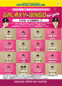 試合を観ながらみんなで楽しむことができるGALAXY BINGOを、《Fighters for Girls Days》では6月8日(水)、9日(木)、11日(土)の3試合で開催。6月8日(水)は来場ピンバッジに加えファンクラブ会員女性限定5,000名様にBINGOカードを1枚プレゼント!また、〈GALAXY BINGO〉カードは通常1枚500円のところ、この日は特別価格200円で販売!!