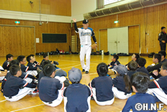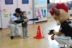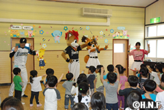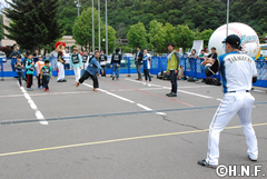 厚沢部町訪問初日は町内の5施設を訪問し、野球やダンスを通じて子どもたちと触れ合いました。2日目、3日目は厚沢部町役場前駐車場でキャッチボールやダンシング球入れなどスポーツ体験コーナーとじゃんけん大会やポリー、フレップ、ファイターズガールによるステージイベントが開催されました。渋田正巳厚沢部町長からは「2014年には吉川、鍵谷両投手が街に来てくれ、これからも後援会含めてファイターズを応援したい。町民と札幌ドームまで応援にいきます」と熱いエールを頂戴しました。