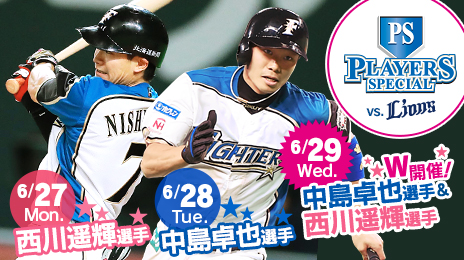6月27日(月)~29日(水)の《Fighters for Girls Days》後半戦は、中島卓選手、西川選手のプレイヤーズスペシャル!!ファンクラブ会員限定のガチャポンコーナーでも中島卓選手・西川選手の《3倍投入デー》を開催!!今をときめく両選手のプレイヤーズスペシャルをお見逃しなく!!