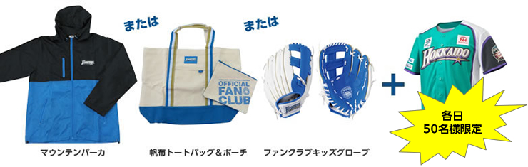 各日、ファンクラブブースにてファンクラブに新規ご入会いただいた方50名様に、選べる入会特典に加えて、《WE LOVE HOKKAIDOシリーズ2016》限定ユニフォームをプレゼント!!当日の来場プレゼントやガチャポンなどの会員特典もその日からお楽しみいただけます♪