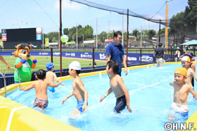 鎌スタのライト側ファールエリアにある鎌スタ☆プールが今年もいよいよオープンいたします!同日はオープニングイベントとして、大好評の水泳教室も行います。