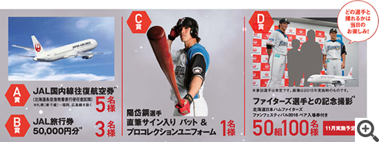 JALグループでは、〈JALに乗って当たる!北海道日本ハムファイターズ応援キャンペーン〉を実施中です。キャンペーン期間中、JALグループ北海道各空港発着便に対象運賃で2回ご搭乗いただいたお客様の中から、「陽岱鋼選手直筆サイン入りのバット&プロコレクションユニフォーム」をはじめ、「選手との記念撮影(ファンフェスティバル2016ペア入場券付き)」や「JAL国内線往復航空券」などが抽選で当たります。皆様のご応募をお待ちしております。