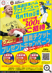 「回転寿司スシロー」北海道全8店舗にて、500円(税抜)以上のご飲食(お持ち帰り含む)、1会計につき、チラシ1枚をお渡しさせていただき、7月30日(土)~8月7日(日)の期間に専用応募フォームからご応募をいただきます。抽選で合計150組300名様にファイターズ観戦チケットをプレゼントいたします。詳細はチラシをご確認ください。