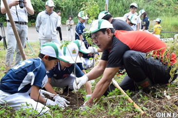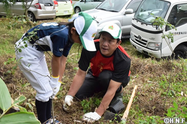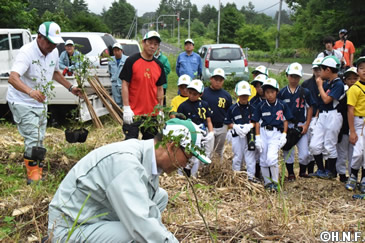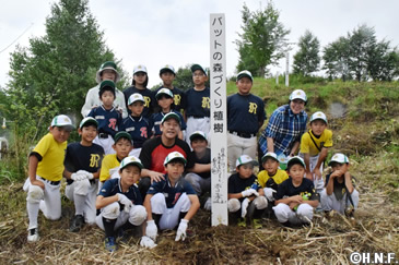バット用材として最良とされるアオダモは、主に北海道の自然林に分布していますが、かつては伐採が計画的に行われていなかったため、将来的に資源が枯渇する恐れがあります。そこで、アオダモの安定供給を目的とした「アオダモ資源育成の会」が2000年に発足。ファイターズはアマチュア各団体などとともに同会の北海道評議会を構成しており、毎年定期的に植林することでバット素材の安定確保を目指して活動を展開しています。