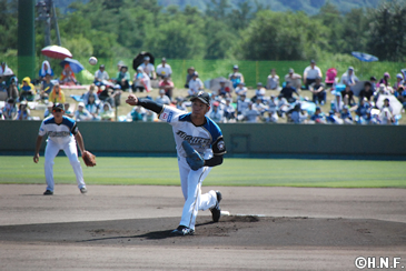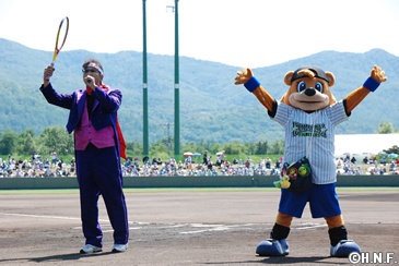 ライトスタンド後方には夕張岳が伺え、球場の四方が美しい山々に囲まれた富良野市民野球場、13日(土)同市初めてのイースタン・リーグ公式戦には2,796名の方が集まりました。この試合先発のルーキー吉田侑樹投手は初回、連続安打を浴び一死一、三塁と立ち上がりランナーを背負いましたが連続三振でピンチを切り抜けます。その後は2つダブルプレーを奪うなどテンポのよいピッチングで自身最長タイとなる7回を投げきり被安打3、無失点と先発投手として見事なピッチングを道民の前で披露しました。一方打線は今季プロ初安打を記録した大嶋匠選手が4回中前適時打で先制、好調の打撃でアピールをすると、1-1の同点で迎えた延長10回には横尾俊建選手が敵失を誘いサヨナラ勝利。打った瞬間ベンチからは選手が飛び出し、殊勲打を放った横尾選手はびしょ濡れになりました。