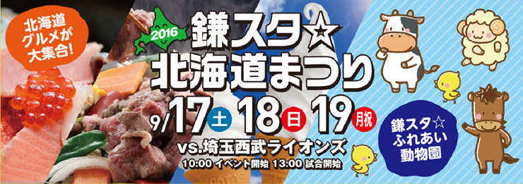 9月17日(土)・18日(日)・19日(月・祝)の3日間、ファイターズ鎌ケ谷スタジアムで行われるイースタンリーグ公式戦(埼玉西武ライオンズ戦)で《鎌スタ☆北海道まつり2016》を開催いたします。美味しい北海道グルメやかわいい動物たちが大集合するなど、大人から子どもまで家族で楽しい一日を満喫できるイベントが盛りだくさん!チケット発売は8月20日(土)から。数量限定のチケットも発売です!