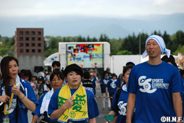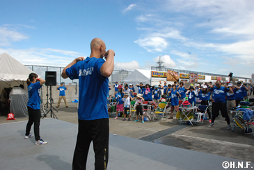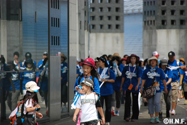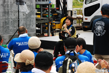 8月21日(土)の試合前、球団のSC(スポーツ・コミュニティ)活動の一環として行っているファイターズウォーキングクラブ「FOOTSTEP FUND~あしあと基金~」2016年の第4回活動を137名の皆様とともに実施しました。前日の大雨の影響と当日の雨予報から、参加される方が少ないのでは、と心配されましたが集合時間には続々と参加される方が集まりました。さっそく、今回のゲスト・ファイターズOBの森本稀哲さんが「皆さんと気持ちよく体を動かすことで、他の人をサポートできるこのイベントは素晴らしいと思います。元気に歩きましょう」と挨拶し、参加者全員とストレッチで体を動かしました。当初は札幌ドームから清田方面へ向かう約7キロのコースを予定していましたが、スタート直前にも大雨警報が発表されたことから、札幌ドーム周辺を周り、後半は札幌ドーム3Fを周回するコースに変更しての実施となりました。
