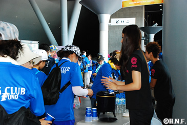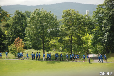 天気予報に反してスタート時は気温26度、まだまだ夏!といわんばかりの太陽を浴びながら、普段はなかなか歩く機会のない、札幌ドーム周辺の樹木の中を3周。ほどよいアップダウンがあり、皆さん全身にたっぷりの汗。給水ポイント(札幌ドーム1Fコンコース)へ着くと、北海道コカ・コーラボトリング株式会社から提供されたアクエリアスウォーターでひと休み。「アクエリアスはお茶や水では補えないミネラルを含んだ、後味すっきりな新しい水で、汗をかいたときに効果的な水分補給ができる商品設計です」という説明があり、その説明が何とも体中にす~っと浸み込んできました。
