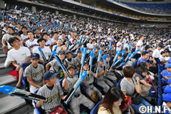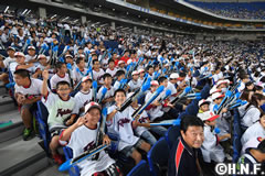 北海道日本ハムファイターズの帝京高校出身杉谷拳士選手、松本剛選手、石川亮選手が今年も「帝京魂―と(ていきょうだましーと)」として、8月30日(火)に行われた東北楽天ゴールデンイーグルス戦(東京ドーム)に野球少年、少女約200名を招待いたしました。今年で2回目となる2016年は3選手がかつて所属していた出身5チームを招待。6回から代走で途中出場し、8回には中前打と気を吐いた杉谷選手は「首位争いをした白熱したプレーを見てもらえると嬉しいです。僕個人としてはOBとして魂を込めたプレーを披露したいと思います」と意気込みを述べました。杉谷選手の出身ツバメ野球部のキャプテンを務める岸田健吾君は「少年野球と違ってプロの球の速さや、打球の勢いはすごかったです」と興奮気味。先輩杉谷選手の打席では応援パネルを掲げて声援をいただき、招待した後輩からは逆に大きな力をもらいました。