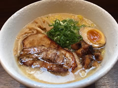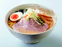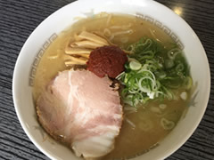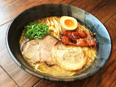 丁寧に処理したゲンコツと鶏ガラを3日間煮込んだスープに店名の「白」にちなんだ白味噌に様々なスパイスを加えた“こっさり”なラーメン。炙ったチャーシューを豪快にトッピング!