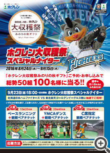 ファイターズオフィシャルスポンサー・ホクレン農業協同組合連合会では、9月23日(金)に札幌ドームで開催される東北楽天ゴールデンイーグルス戦の観戦チケットやイベントの参加券などが当たる〈ホクレン大収穫祭スペシャルナイターキャンペーン〉を、9月15日(木)まで実施しております。