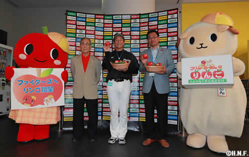 北海道日本ハムファイターズは本日9月15日(木)札幌ドームにおきまして「美園リンゴ会」の大宮幸一会長、三井一敏豊平区長より、札幌市豊平区内の環状通リンゴ並木で収穫されたリンゴを贈呈いただきました。13年目となる今年は「きたかみ」という品種にファイターズのロゴや栗山監督の背番号「80」が入った真っ赤なリンゴが手渡されました。栗山監督は「“寿”というイメージのする真っ赤なリンゴを食べて、優勝を目指して頑張ります」と強く意気込みを語りました
