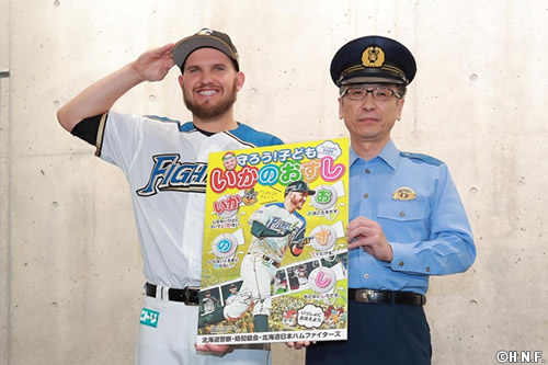 北海道警察本部生活安全部長・安部雅弘警視正とともにポスターを披露したレアード選手は「いつも元気いっぱいに応援してくれる子供たちが犯罪にあわないように『いかのおすし』を覚えてほしいです。僕もお寿司をたくさん握って、みんなが『いかのおすし』を覚えてくれるように頑張ります」と、メッセージを送りました。