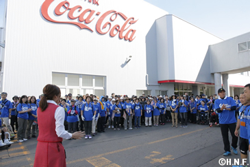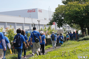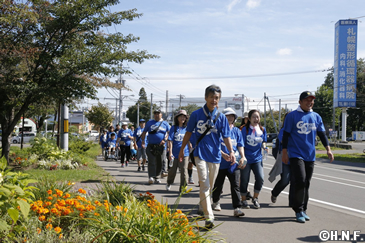 北海道内の高い山々では木々が赤く色づき始め、徐々に秋の足音が大きくなってきましたが、この日の札幌は気温22度と汗ばむ陽気。沿道はコスモスやキンモクセイなどこの時期を代表する花々が咲き誇り、鮮やかな色彩が目を楽しませてくれました。折り返し点では協賛企業の北海道コカ・コーラボトリングからドリンクの提供があり、ガイドの方の案内で工場内で天然水「い・ろ・は・す」を採水する様子を見学させていただきました。