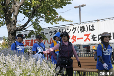 北海道日本ハムファイターズでは、SC(スポーツ・コミュニティ)活動の一環として、《ファイターズウォーキングクラブ「FOOTSTEP FUND~あしあと基金~」》の2016年第5回活動を9月24日(土)の東北楽天ゴールデンイーグルス24回戦(札幌ドーム)開始前に実施しました。ファイターズOBの稲田直人さんが参加し、札幌ドームと北海道コカ・コーラボトリング札幌工場(札幌・清田区)間の約7キロをウォーキング。参加者132人の総歩数は132万4516歩となり、10歩1円換算で13万2452円を一般社団法人日本車椅子ソフトボール協会へ寄付します。