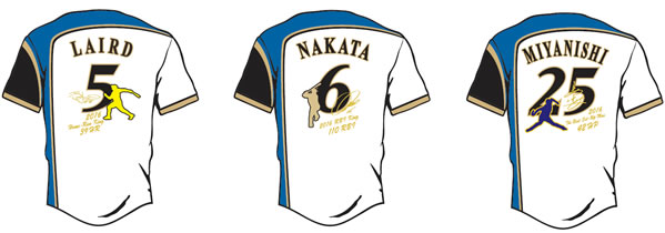 本人が着用していたものと同仕様のユニフォームに各選手の直筆サインが入っています。