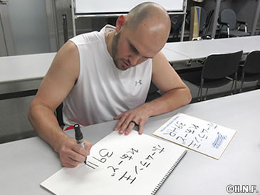 今回のタイトルグッズ製作にあたり、レアード選手には直筆で「ホームラン王 れあーど 39HR」の文字をしたためてもらいました。ひらがなに苦戦していたものの、手本を見ながら一画一画丁寧に書き、本人も納得の出来となりました!