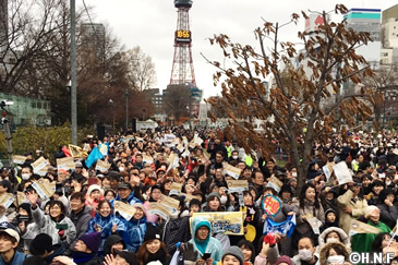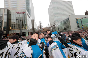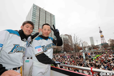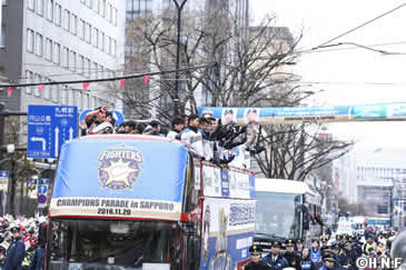 北海道日本ハムファイターズは11月20日(日)、札幌市内中心部で優勝パレードを行いました。パレードは北3条広場前を出発点に、オープンカーとスカイバスに分乗してすすきの交差点までの約1キロ、駅前通を南進。沿道には2006年の15万人に次ぐ13万8000人(主催者発表)の皆様に詰め掛けていただき、10年ぶり日本一の感動を改めてかみしめました。
