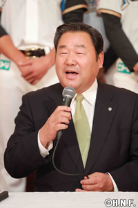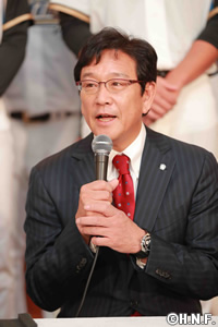 「報道の皆様におかれましては、ご多忙のところ足をお運びいただき、誠にありがとうございます。歴史的建造物であり国の重要文化財である豊平館でこのような会見を催すことができ、本当にうれしく思いますし、関係の皆様方に感謝申し上げます。先ほど壇上の8名と本契約を結ばせていただきました。各スカウトが自信と誇りをもって選んできた選手ばかりです。来年からのさらなる連覇を支えてくれるものと期待しているところです。野球を通じて社会に貢献してほしい、強い存在感のある人間に育ってほしいと申し上げました。野球で成功する、ファンに感謝する、そして北海道に必要な人間になる、この三点を守ってほしいと伝えました。どうぞよろしくお願い申し上げます」