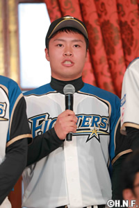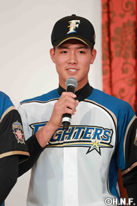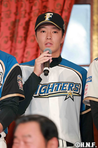 「1年間スカウト会議に出て色んな話をしながら進めてきた中で、最高のドラフトができたと思っています。きょうを境にチームでお預かりして大活躍できるよう頑張っていきますので、どうかご協力のほどよろしくお願いいたします。ファイターズがやっていることはある意味明治維新のようであり、球界の常識にとらわれずに皆で前に進んでいます。新しいチームになっていくには新しい力が必要です。頭の中では色んなイメージが湧いていて、プラスアルファの力を加えられたら必ず連覇できると信じています。応援のほどよろしくお願いいたします」
