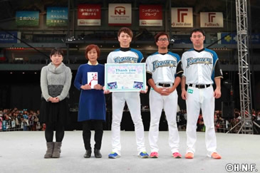 リリーフ陣は体を動かせず声を発することのできない意思伝達支援機器利用者をサポートしたいと、今シーズンは17投手で120ホールド、42セーブを記録。39ホールド、2セーブで最優秀中継ぎ投手のタイトルを獲得した宮西尚生投手は「みんなで力を合わせて積み重ねた数字。これからもこのようなご縁を大切に活動していきます」と話していました。また、自立援助ホームを代表して「シーズ南平岸」の施設長、屋代通子様から栗山英樹監督へ感謝状をお贈りいただきました。
