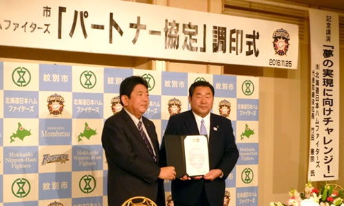 紋別市宮川良一市長、北海道日本ハムファイターズ竹田憲宗社長による調印式が、紋別市内ホテルで関係者約30名の前で行われました。宮川市長は「パートナー協定を一つの出発点として、紋別市民に元気を与えていただきたい。」と述べると、竹田社長は「念願であった紋別市とのパートナー協定を締結でき、感動しております。まちづくりのプロセスをともに歩んでいきたい。」と力強く誓いました。