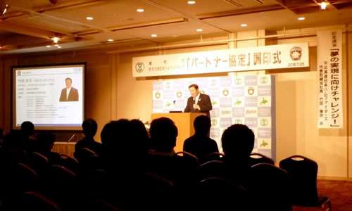 調印式終了後には、竹田社長が「夢の実現に向けチャレンジ!」と題した記念講演を行いました。「球団理念であるSports Communityの実現に向けて、更なる活動を北海道民の皆さんと一緒に進めていきたい。」と講演を締めくくりました。